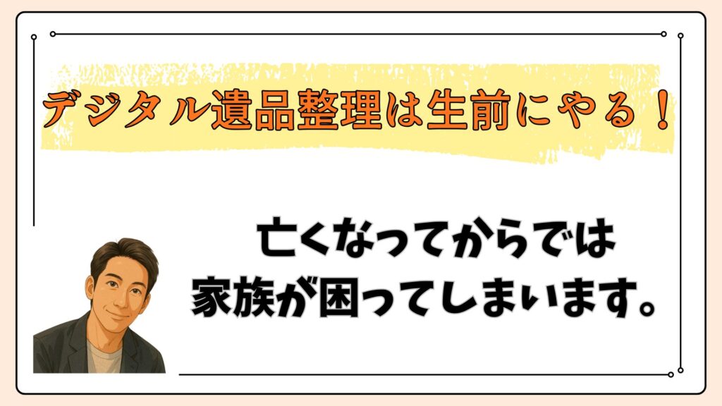 デジタル遺品は「見えない」ため、家族は整理に迷いやすく、負担が大きくなります。
