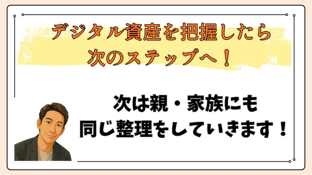 自分のデジタル遺品・資産を把握し家族が困るポイントに気づき整理を始める準備ができました。